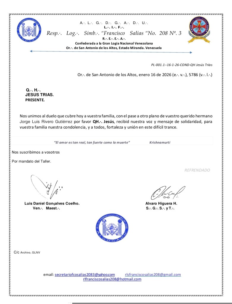 Este lamentable suceso enluta no solo a su familia consanguínea, sino también a la familia espiritual que conformamos los masones venezolanos. En momentos como este, la cadena fraterna se estrecha en solidaridad, y la columna truncada se alza como símbolo de la vida interrumpida, del legado que permanece y del recuerdo que nos convoca.