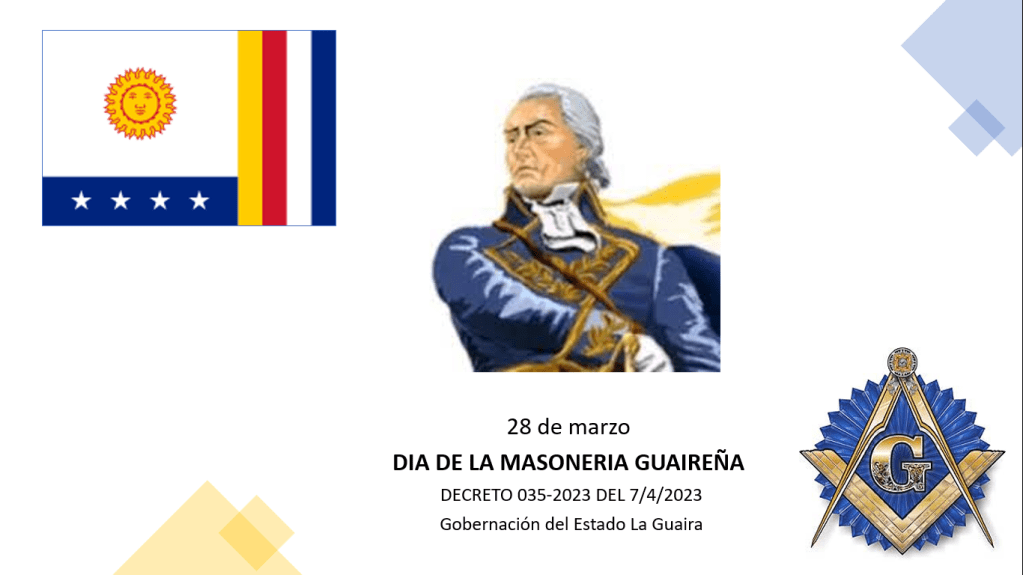 El Gobernador del Estado La Guaira, Abogado José Alejandro Terán, emitió el pasado 7 de abril del 2023, el Decreto N° 035-2023 a través del cual se declara el 28 de marzo de cada año, «DIA DE LA MASONERÍA GUAIREÑA» , en conmemoración del natalicio del Venezolano mas Universal QH Francisco de Miranda y de la fundación de la Respetable Logia Unanimidad N° 3 , en fecha 4 de abril de 1824.