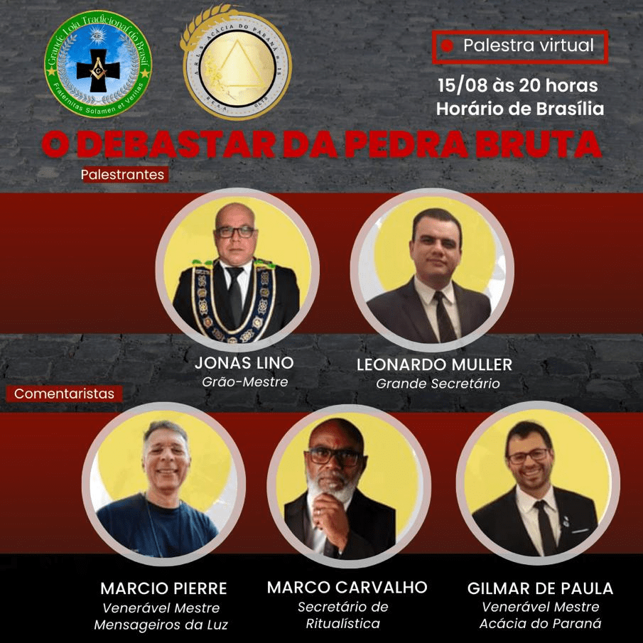 Haciendo gala de nuestro tratado de Amistad y Reconocimiento mutuo con la Grande Loja Tradicional Do Brasil, se dio esta martes 15/8/2023 una conferencia virtual por Meet Google, sobre Debastar la Piedra Bruta, donde las Grandes Dignidades de la GLTB, asi como el VM de la Resp Logia Acacia de Paraná y el VM de la Resp. Logia Mensageiros da Luz dieron sus cometarios sobre este importante tema que siempre debe estar presente en todo Masón. A pesar que las intevenciones fueron es Portugues se pudo ente