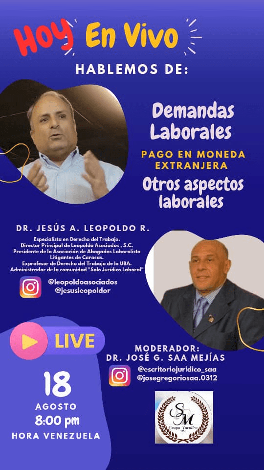 Estás cordialmente invitado, a las 8:00 p.m., a un Live por Instagram, conversatorio entre el Dr. Jose Gregorio Saa Mejías y Dr. Jesús A. Leopoldo R., Sobre: