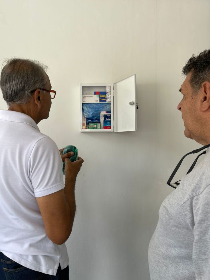 La donación fue recibida por el MRGM Sixto López González, quien con la ayuda del QH Wilmer Monterrey colocaron el Botiquín de Primero Auxilios en un lugar de fácil acceso para todos, pero inaccesible para los pequeños.