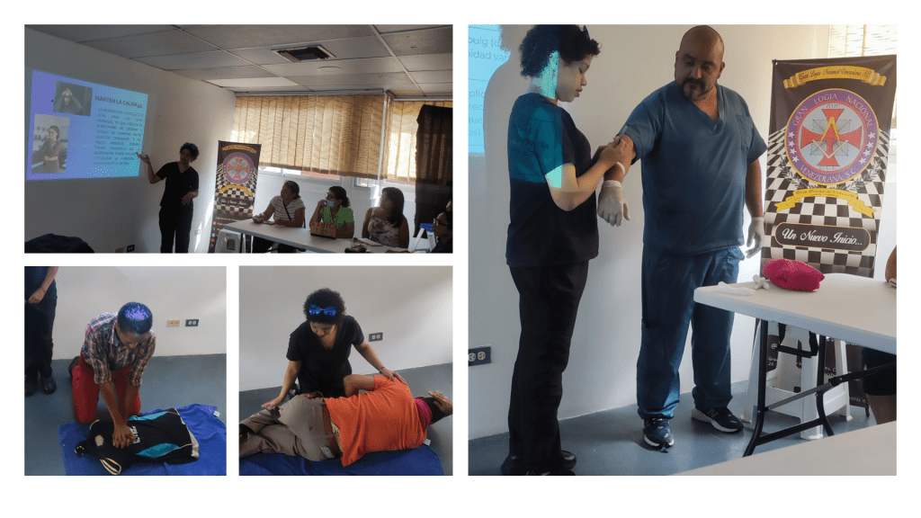 Con la excelente presentación de la Promotora Social de Salud Sra. Betania Bautista y el Lic. y QH Ramón Adrián, y una entusiasmada asistencia, se realizó el primer «Taller básico de Primeros Auxilios» en el Salón de Usos Múltiples de la Gran Logia Nacional Venezolana -GLNV- en Colinas de Bello Monte, donde los participantes pudieron conocer que debo hacer en caso de un accidente con paciente traumatizado, que debe tener un botiquín de primeros auxilios, mantener la calma ante un accidente, la técnica de valoración primaria, manejo de hemorragias, reanimación cardiopulmonar, etc. así como distintas técnicas básicas para atender alguna emergencia donde se hicieron distintas practicas.