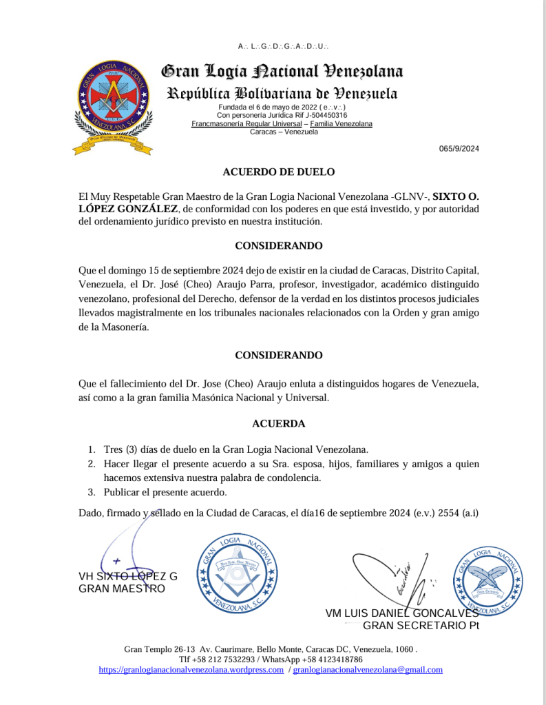 La Gran Logia Nacional Venezolana -GLNV- y particularmente el MRGM Sixto López González, con quien mantuvo excelentes lazos de amistad, envía sus mas sentidas y sinceras palabras de condolencias a su esposa, hijos y demás familiares y amigos.
