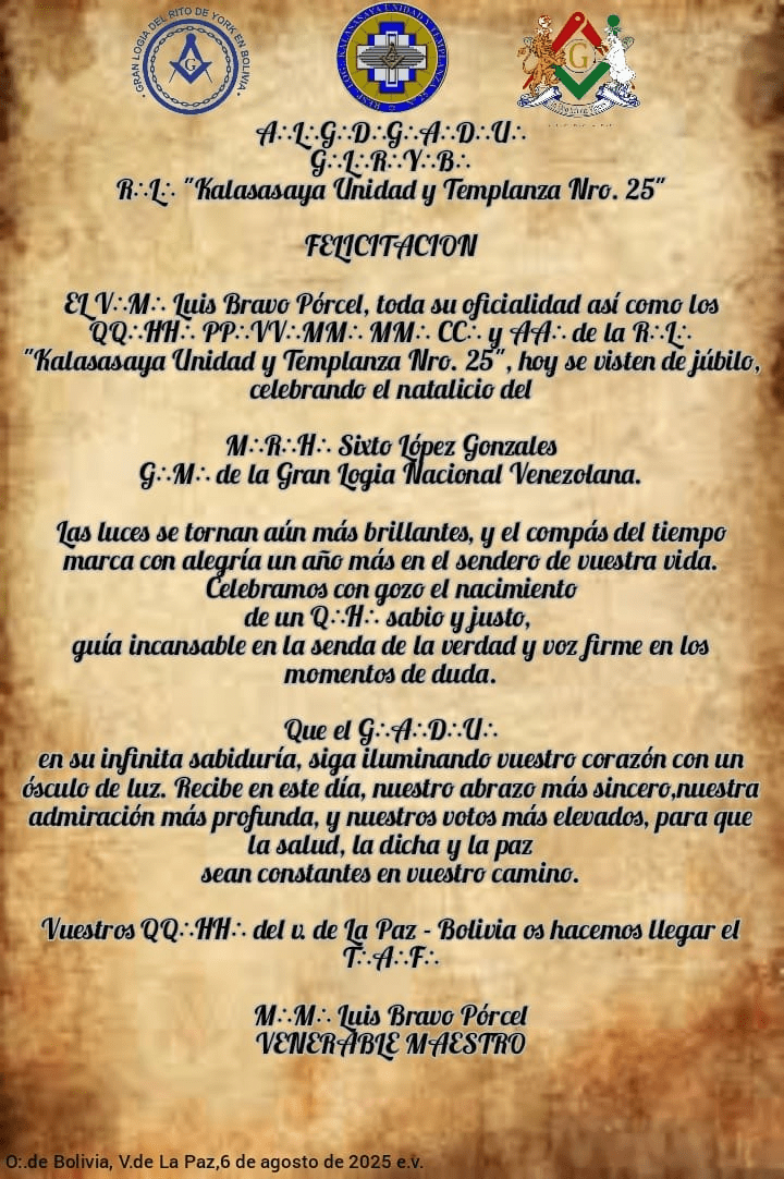 Felicitaciones recibidas de los QQHH de La Paz Bolivia!!!Que alegría !!! El VM Luis Bravo con el MRGM López Comparte esto: Haz clic para compartir en X (Se abre en una ventana nueva) X Haz clic para compartir en Facebook (Se abre en una ventana nueva) Facebook Me gusta Cargando... Relacionado Deja un comentario Cancelar la respuesta Δ
