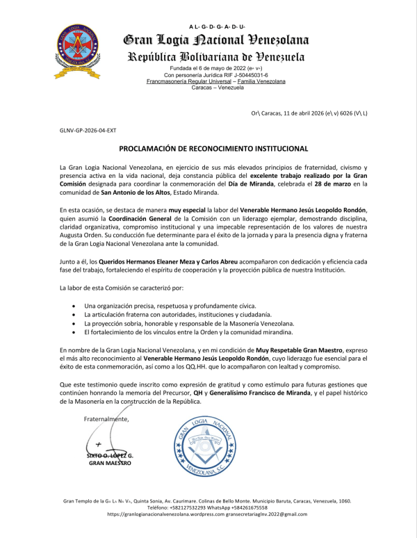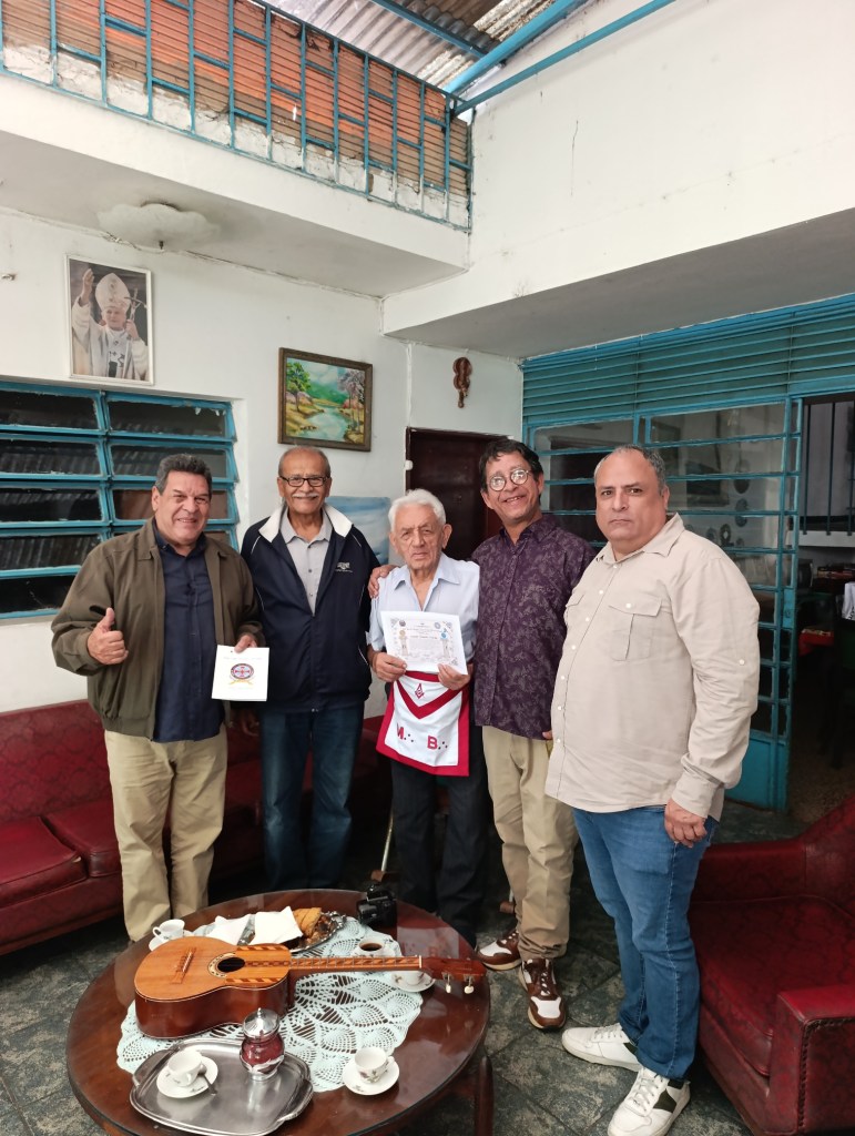 En cumplimiento de los más elevados principios de fraternidad y respeto a la trayectoria masónica, una distinguida comitiva de la Respetable Logia Símbolo 113 N.º 2, afiliada a la Gran Logia Nacional Venezolana, realizó el 10/4/2026 una visita especial al Querido Hermano Ramón Eduardo Castillo, en su residencia ubicada en la Urbanización Los Dos Caminos, en la ciudad de Caracas.