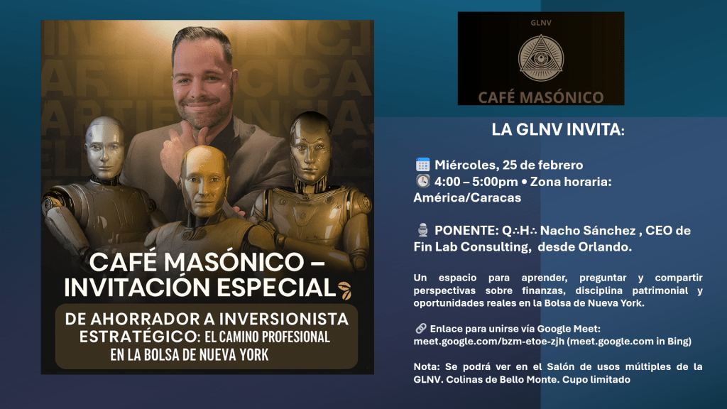 En el marco de nuestra constante búsqueda de conocimiento útil y herramientas transformadoras para el bienestar integral de la comunidad masónica, la Gran Logia Nacional Venezolana (GLNV) celebró el domingo 24 de agosto con entusiasmo la exitosa Masterclass dictada desde Miami por el QH Nacho, CEO de Fin Lab Consulting.